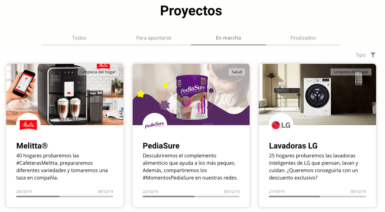 - Acceder al menú superior llamado “Proyectos”. Existen 3 secciones (Para apuntarse, en marcha o finalizados)